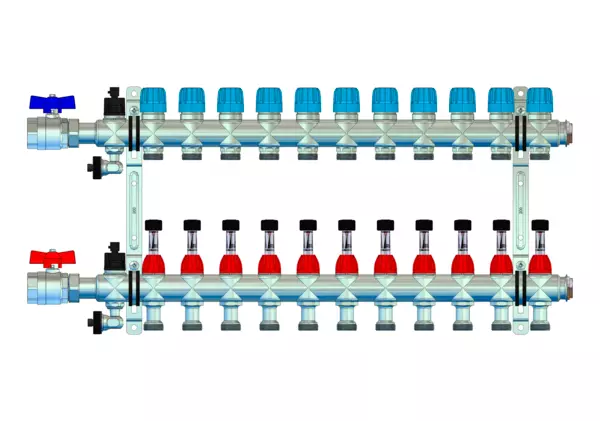 strawa FB-Anschlussverteiler e-class 18-KH25-SFEE 11 Hkr.,BxHxT: 710x320x67 mm, DFA min/max. THV mit Aufnahme für EGO-Regelantrieb mit 1" Kugelhahn und Spül-, Füll-, Entleer- und Entlüftungsventil