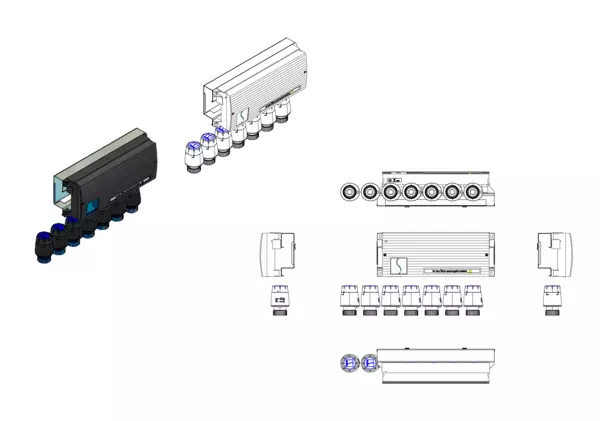 Das Vorverdrahtungselement ist eine effiziente Lösung für den Anschluss an Anschlussverteiler der e-class 53, 63 Serie oder Comfort-Anschlussstationen FBH-63, FBR-63, FBM-63. Es besteht aus einer hochwertigen Klemmleiste und vorverdrahteten Stellantrieben. Die Stellantriebe sind bereits auf der Klemmleiste angebracht, wodurch die Installation deutlich vereinfacht wird. Die Montage erfolgt durch Befestigung der Klemmleiste auf dem Montageblech im Verteilerschrank, entweder über oder neben dem Heizkreisverteiler. Die Stellantriebe werden direkt auf die Ventileinsätze (Aufnahmegewinde M30x1,5) des Rücklaufbalkens aufgeschraubt.