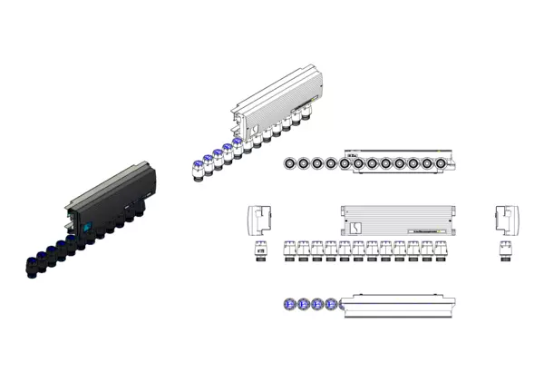 Das Vorverdrahtungselement ist eine effiziente Lösung für den Anschluss an Anschlussverteiler der e-class 53, 63 Serie oder Comfort-Anschlussstationen FBH-63, FBR-63, FBM-63. Es besteht aus einer hochwertigen Klemmleiste und vorverdrahteten Stellantrieben. Die Stellantriebe sind bereits auf der Klemmleiste angebracht, wodurch die Installation deutlich vereinfacht wird. Die Montage erfolgt durch Befestigung der Klemmleiste auf dem Montageblech im Verteilerschrank über oder neben dem Heizkreisverteiler. Die Stellantriebe werden direkt auf die Ventileinsätze (Aufnahmegewinde M30×1,5) des Rücklaufbalkens aufgeschraubt. - Bestandteile: