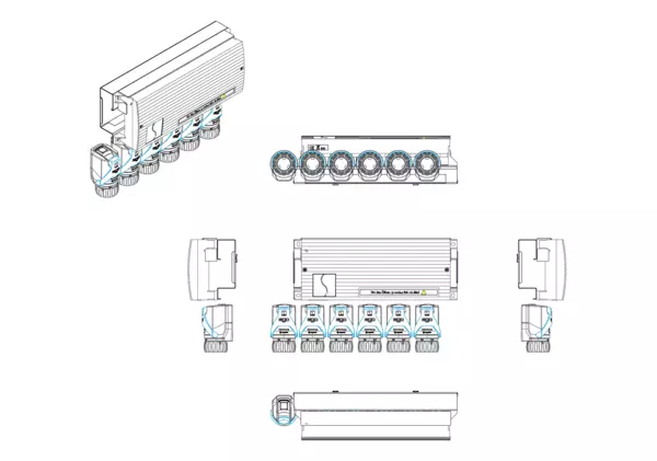 Das Vorverdrahtungselement besteht aus einer Klemmleiste und EGO-Regelantrieben und ist speziell für den Anschluss an den Anschlussverteiler e-class 18 oder Comfort-Anschlussstationen (FBH-18, FBR-18, FBM-18) konzipiert. Die EGO-Regelantriebe sind bereits auf der Klemmleiste vorverdrahtet. Die Montage erfolgt bauseits mit dem Montageblech im Verteilerschrank über oder neben dem Heizkreisverteiler. Die EGO-Regelantriebe werden auf den Ventileinsätzen (EGO-Schnellverschluss) des Rücklaufbalkens aufgeschraubt. Die Vorverdrahtung gewährleistet über die EGO-Regelantriebe den vollautomatischen hydraulischen Abgleich der Heizkreise.