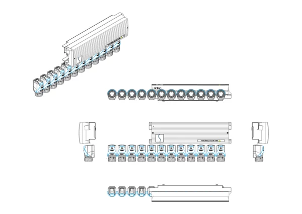 Das Vorverdrahtungselement besteht aus einer Klemmleiste und EGO-Regelantrieben und ist speziell für den Anschluss an den Anschlussverteiler e-class 18 oder Comfort-Anschlussstationen (FBH-18, FBR-18, FBM-18) konzipiert. Die EGO-Regelantriebe sind bereits auf der Klemmleiste vorverdrahtet. Die Montage erfolgt bauseits mit dem Montageblech im Verteilerschrank über oder neben dem Heizkreisverteiler. Die EGO-Regelantriebe werden auf den Ventileinsätzen (EGO-Schnellverschluss) des Rücklaufbalkens aufgeschraubt. Die Vorverdrahtung gewährleistet über die EGO-Regelantriebe den vollautomatischen hydraulischen Abgleich der Heizkreise.