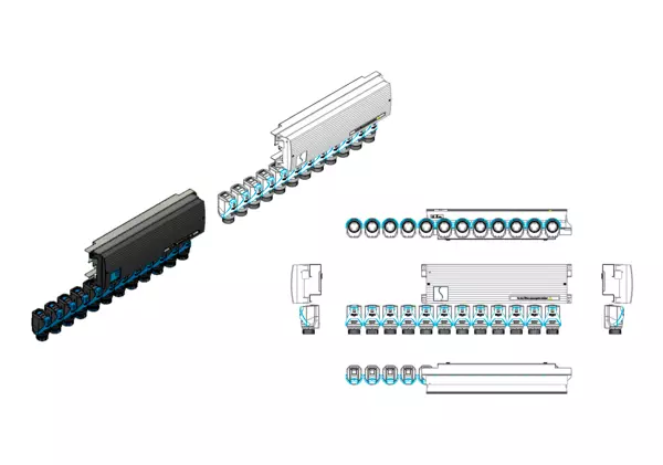 Das Vorverdrahtungselement besteht aus einer Klemmleiste und EGO-M30 Regelantrieben und ist speziell für den Anschluss an den Anschlussverteiler e-class 63 oder Standard und Comfort-Anschlussstationen (FBH-63, FBR-63, FBM-63) konzipiert. Die EGO-M30 Regelantriebe sind bereits auf der Klemmleiste vorverdrahtet. Die Montage erfolgt bauseits mit dem Montageblech im Verteilerschrank über oder neben dem Heizkreisverteiler. Die EGO-Regelantriebe werden auf den Ventileinsätzen (M30x1,5) des Rücklaufbalkens aufgeschraubt. Die Vorverdrahtung gewährleistet über die EGO-M30-Regelantriebe den vollautomatischen hydraulischen Abgleich der Heizkreise.