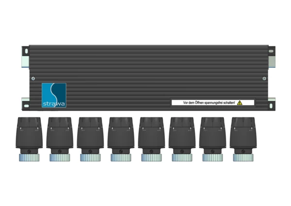 strawa Comfort Vorverdrahtung RT8-STA14 + strawatherm 230V Heizen/Kühlen 8 Hkr.,BxHxT: 425 x 193 x 84 mm, bestehend aus Klemmleiste 230 V (max. 8 Raumthermostate) und auf der Klemmleiste vorverdrahtete strawatherm Stellantrieben 230 V