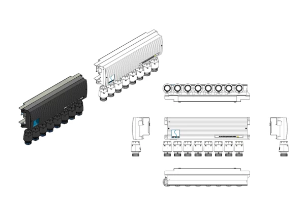 Vorverdrahtung Klemmleiste mit strawatherm Stellantrieben zum Heizen und Kühlen, für Anschlussverteiler e-class 63 oder Comfort-Anschlussstationen FBH-63, FBR-63, FBM-63, die Stellantriebe sind auf der Klemmleiste vorverdrahtet, die Klemmleiste wird bauseits mit dem Montageblech im Verteilerschrank über oder neben dem Heizkreisverteiler montiert, die Stellantriebe werden auf den Ventileinsätzen des Rücklaufbalkens aufgeschraubt.