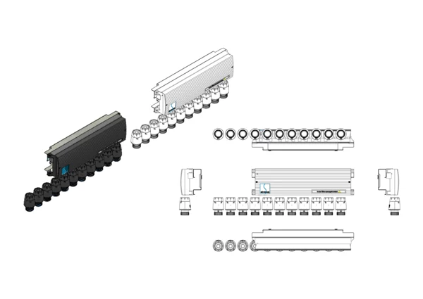 Vorverdrahtung Klemmleiste mit strawatherm Stellantrieben zum Heizen und Kühlen, für Anschlussverteiler e-class 63 oder Comfort-Anschlussstationen FBH-63, FBR-63, FBM-63, die Stellantriebe sind auf der Klemmleiste vorverdrahtet, die Klemmleiste wird bauseits mit dem Montageblech im Verteilerschrank über oder neben dem Heizkreisverteiler montiert, die Stellantriebe werden auf den Ventileinsätzen des Rücklaufbalkens aufgeschraubt.