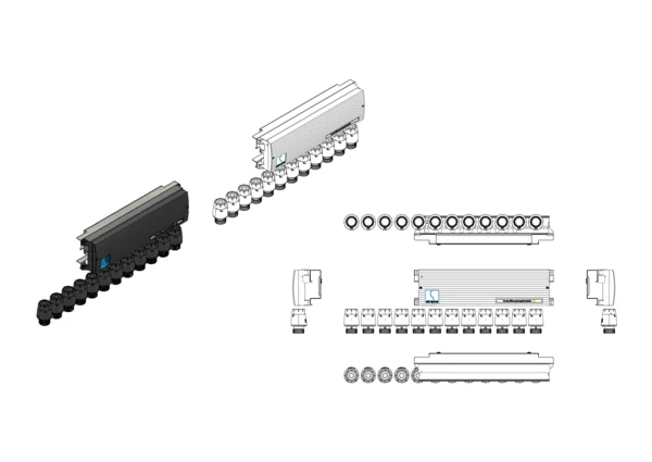 Vorverdrahtung Klemmleiste mit strawatherm Stellantrieben zum Heizen und Kühlen, für Anschlussverteiler e-class 63 oder Comfort-Anschlussstationen FBH-63, FBR-63, FBM-63, die Stellantriebe sind auf der Klemmleiste vorverdrahtet, die Klemmleiste wird bauseits mit dem Montageblech im Verteilerschrank über oder neben dem Heizkreisverteiler montiert, die Stellantriebe werden auf den Ventileinsätzen des Rücklaufbalkens aufgeschraubt.