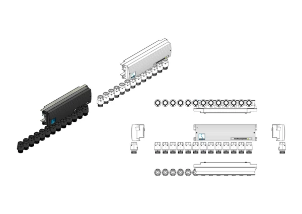 Vorverdrahtung Klemmleiste mit strawatherm Stellantrieben zum Heizen und Kühlen, für Anschlussverteiler e-class 63 oder Comfort-Anschlussstationen FBH-63, FBR-63, FBM-63, die Stellantriebe sind auf der Klemmleiste vorverdrahtet, die Klemmleiste wird bauseits mit dem Montageblech im Verteilerschrank über oder neben dem Heizkreisverteiler montiert, die Stellantriebe werden auf den Ventileinsätzen des Rücklaufbalkens aufgeschraubt.