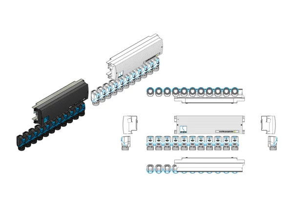 Vorverdrahtung Klemmleiste mit EGO-Regelantrieben zum Heizen und Kühlen, für Anschlussverteiler e-class 18 oder Comfort-Anschlussstationen FBH-18, FBR-18, FBM-18, die EGO-Regelantriebe sind auf der Klemmleiste vorverdrahtet, die Klemmleiste wird bauseits mit dem Montageblech im Verteilerschrank über oder neben dem Heizkreisverteiler montiert, die EGO-Regelantriebe werden auf den Ventileinsätzen (EGO-Schnellverschluss) des Rücklaufbalkens aufgeschraubt . Die Vorverdrahtung gewährleistet über den EGO-Regelantrieb den vollautomatischen hydraulischen Abgleich der Heizkreise.