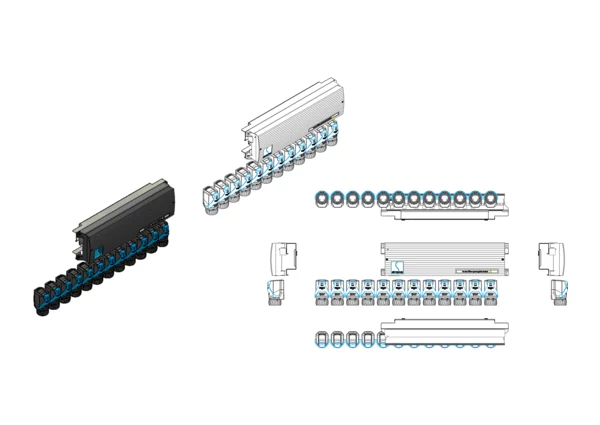 Vorverdrahtung Klemmleiste mit EGO-Regelantrieben zum Heizen und Kühlen, für Anschlussverteiler e-class 18 oder Comfort-Anschlussstationen FBH-18, FBR-18, FBM-18, die EGO-Regellantriebe sind auf der Klemmleiste vorverdrahtet, die Klemmleiste wird bauseits mit dem Montageblech im Verteilerschrank über oder neben dem Heizkreisverteiler montiert, die EGO-Regelantriebe werden auf den Ventileinsätzen (EGO-Schnellverschluss) des Rücklaufbalkens aufgeschraubt . Die Vorverdrahtung gewährleistet über den EGO-Regelantrieb den vollautomatischen hydraulischen Abgleich der Heizkreise.