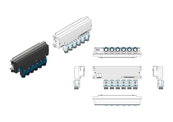 Vorverdrahtung Klemmleiste mit EGO-M30 Regelantrieben zum Heizen und Kühlen, für Anschlussverteiler e-class 63 oder Comfort-Anschlussstationen FBH-63, FBR-63, FBM-63, die EGO-M30-Regellantriebe sind auf der Klemmleiste vorverdrahtet, die Klemmleiste wird bauseits mit dem Montageblech im Verteilerschrank über oder neben dem Heizkreisverteiler montiert, die EGO-M30-Regelantriebe werden auf den Ventileinsätzen des Rücklaufbalkens aufgeschraubt . Die Vorverdrahtung gewährleistet über den EGO-M30-Regelantrieb den vollautomatischen hydraulischen Abgleich der Heizkreise.