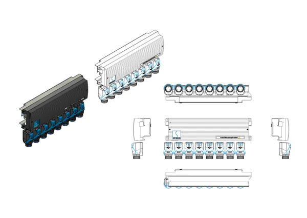 Vorverdrahtung Klemmleiste mit EGO-M30 Regelantrieben zum Heizen und Kühlen, für Anschlussverteiler e-class 63 oder Comfort-Anschlussstationen FBH-63, FBR-63, FBM-63, die EGO-M30-Regellantriebe sind auf der Klemmleiste vorverdrahtet, die Klemmleiste wird bauseits mit dem Montageblech im Verteilerschrank über oder neben dem Heizkreisverteiler montiert, die EGO-M30-Regelantriebe werden auf den Ventileinsätzen des Rücklaufbalken aufgeschraubt . Die Vorverdrahtung gewährleistet über den EGO-M30-Regelantrieb den vollautomatischen hydraulischen Abgleich der Heizkreise.