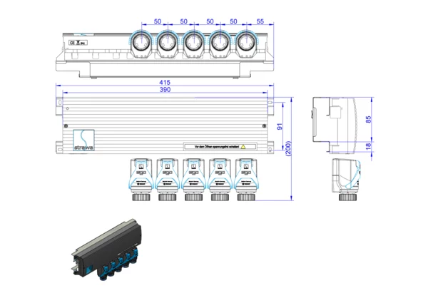 bestehend aus Klemmleiste 230 V (max. 8 Raumthermostate) und auf der Klemmleiste vorverdrahtete strawatherm Stellantrieben 230 V