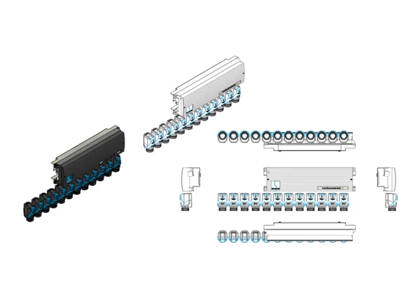 Vorverdrahtung Klemmleiste mit strawatherm Stellantrieben zum Heizen und Kühlen, für Anschlussverteiler e-class 63 oder Comfort-Anschlussstationen FBH-63, FBR-63, FBM-63, die Stellantriebe sind auf der Klemmleiste vorverdrahtet, die Klemmleiste wird bauseits mit dem Montageblech im Verteilerschrank über oder neben dem Heizkreisverteiler montiert, die Stellantriebe werden auf den Ventileinsätzen des Rücklaufbalkens aufgeschraubt.