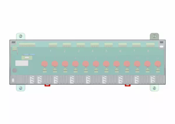 Elektrischer Verteiler zur intelligenten und energieeffizienten Regelungen mit flexibel konfigurierbarer Kanalzuordnung. Die Logikklemmleiste ermöglicht eine frei wählbare, bauseitige Zuordnung von thermischen Stell- bzw. Regelantrieben zu den jeweiligen Raumbediengeräten. Die Zuordnung der Antriebszonen erfolgt anwenderseitig über einen integrierten Wählschalter, wodurch eine bedarfsgerechte Regelstruktur und hohe Anpassungsfähigkeit an unterschiedliche Raumzonen gewährleistet wird. Der Einbau erfolgt innerhalb des Flächenverteilerschranks. Die Lieferung kann wahlweise erfolgen mit Montageblech für Comfort-Schränke, mit Montageblech für Standardschränke oder ohne Montageblech (siehe 8. Artikelübersicht). Kanalwahl Über die zwölf integrierten Drehschalter kann jedem einzelnen Raumthermostat individuell mindestens ein thermischer Stell- bzw. Regelantrieb oder optional mehrere Antriebe pro Kanal zugeordnet werden. Zeitsignal Die Klemme 8 dient als Zeitkanal zur Absenkung der eingestellten Temperatur. Das Zeitprogramm kann entweder durch einen Raumthermostat mit Zeitprogramm oder durch eine externe Schaltuhr vorgegeben werden. Durch den entsprechenden Anschluss können alle Heizzonen zeitabhängig abgesenkt werden. Pumpensteuerung Über die vorgesehenen Klemmen kann eine Pumpe direkt angesteuert werden. Die Pumpenlogik dient zur bedarfsabhängigen Ansteuerung der Pumpe. D.h., sobald ein Stell- / Regelantrieb aktiv ist, geht die Pumpe in Betrieb. Ist keiner der angeschlossenen Antriebe angesteuert, wird die Pumpe abgeschaltet.