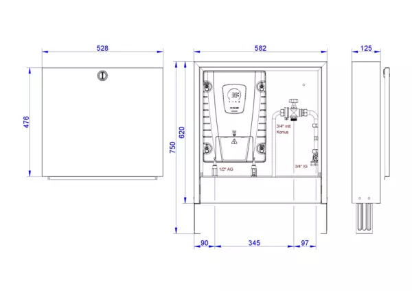 - Breite x Höhe x Tiefe: 582 x 620-750 x 125 mm