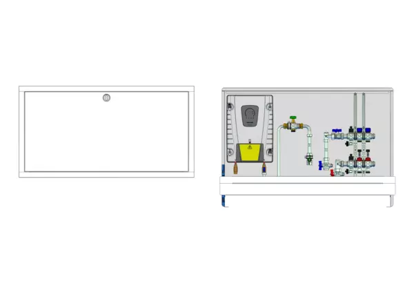 strawa Friwara DLE1-W1-FB-WMZ-63- UPS-69-2,5 2 Hkr.,BxHxT: 1050 x 725 x 122 mm, mit Durchlauferhitzer ISX L 11-13,5 kW 2 Heizkreise im Unterputz-Schrank 69 Typ 2,5