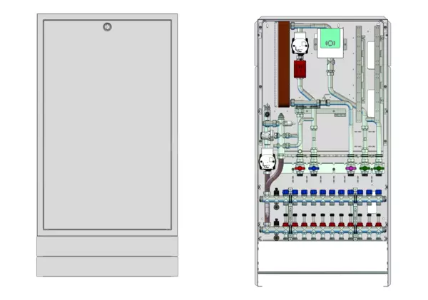 Die Wohnungsstation Friwara W-FBR dient der Warmwasserversorgung und zusätzlich der Versorgung und Regelung von Flächenheizungen mit Festwertregler 20-50 °C mit integrierter Pumpe.