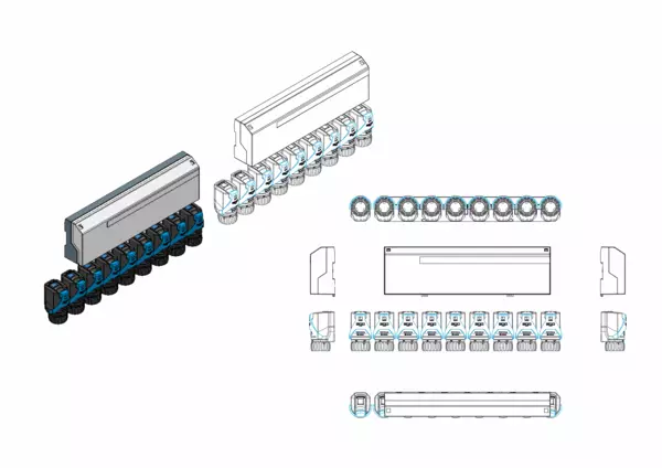 Die Einheit umfasst eine strawalogiX Logikklemmleiste RT8-STA12 für 230 V sowie werkseitig vorverdrahtete, intelligente, elektrothermische EGO-Regelantriebe (230 V). Diese ermöglichen einen automatisierten, bedarfsorientierten hydraulischen Abgleich der einzelnen Heiz- bzw. Kühlkreise eines Flächenverteilers.