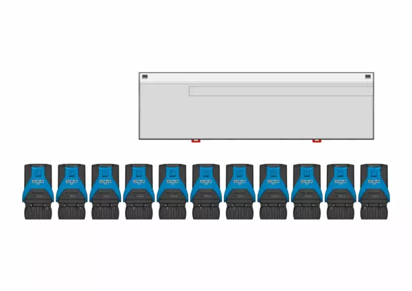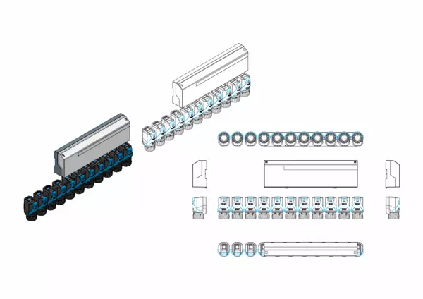 Die Einheit umfasst eine strawalogiX Logikklemmleiste RT8-STA12 für 230 V sowie werkseitig vorverdrahtete, intelligente, elektrothermische EGO-Regelantriebe (230 V). Diese ermöglichen einen automatisierten, bedarfsorientierten hydraulischen Abgleich der einzelnen Heiz- bzw. Kühlkreise eines Flächenverteilers.