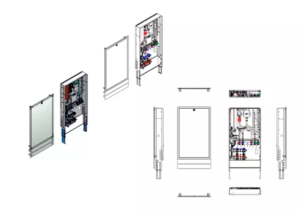 Trinkwassererwärmung max. 22 l/min, Festwertregelung 20-50 Grad Celsius, Verteiler mit Durchflussanzeiger 0-3 l/min im Vorlaufbalken und Thermostatventileinsatz M30x1,5 im Rücklaufbalken, kupfergelötet Plattenwärmetauscher, Unterputz-Schrank mit Frontblende RAL 9016
