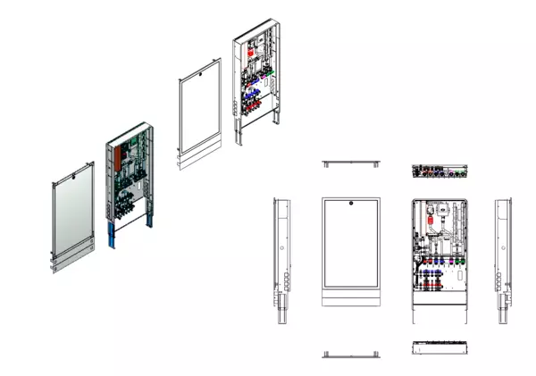 Trinkwassererwärmung max. 22 l/min, Festwertregelung 20-50 Grad Celsius und Hochtemperaturabgang, Verteiler mit Durchflussanzeiger 0-3 l/min im Vorlaufbalken und Thermostatventileinsatz M30x1,5 im Rücklaufbalken, kupfergelötet Plattenwärmetauscher, Unterputz-Schrank mit Frontblende RAL 9016