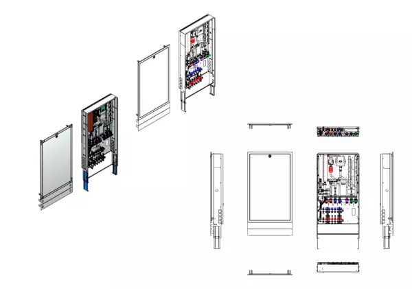 Trinkwassererwärmung max. 22 l/min, Festwertregelung 20-50 Grad Celsius und Hochtemperaturabgang, Verteiler mit Durchflussanzeiger 0-3 l/min im Vorlaufbalken und Thermostatventileinsatz M30x1,5 im Rücklaufbalken, kupfergelötet Plattenwärmetauscher, Unterputz-Schrank mit Frontblende RAL 9016
