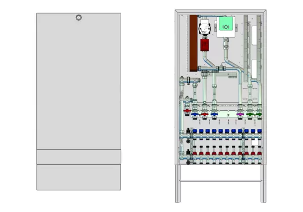 Flächenheizungs- bzw. Kühlwasserversorgung über Niedertemperatur-Strang: Über einen zusätzlichen Primär-Heizungs- bzw. Kühlkreisanschluss in der Friwara Wohnungsstation wird der Heiz- bzw. Kühlkreisverteiler mit Heizwasser bzw. Kühlwasser versorgt. Der benötigte Volumenstrom der Flächenheizung- bzw. –kühlung wird über die im primärseitigen Versorgerkreis verbauten Pumpe realisiert, in der Station ist hierfür keine Pumpe verbaut. Heizkreisverteiler mit manuellem hydraulischen Abgleich der Heizkreise am Duchflussanzeiger und Thermostatventileinsetzen mit Aufnahmegewinde M30x1,5. Des Weiteren können die Klemmleiste und die Stellantriebe montiert und vorverdrahtet werden.