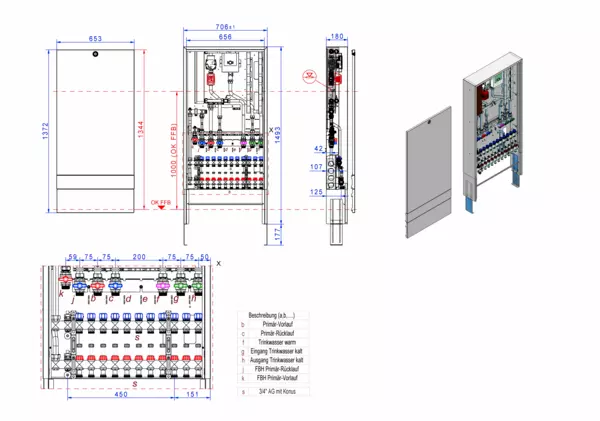 1. eitersystem mit Trinkwassererwärmung max. 22 l/min, vertikale Anschlussgarnitur mit Wärmezählerverrohrung, Verteiler mit Durchflussanzeiger 0-3 l/min im Vorlaufbalken und Thermostatventileinsatz M30x1,5 im Rücklaufbalken, kupfergelötet Plattenwärmetauscher, Aufputz-Schrank in RAL 9016