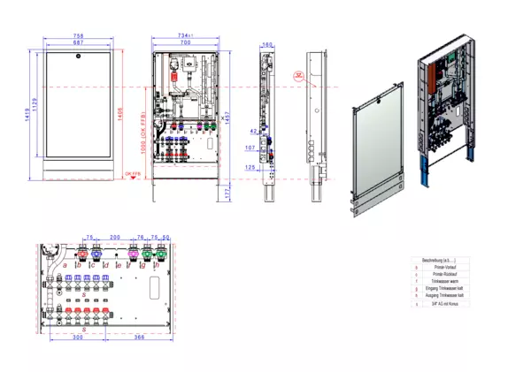Trinkwassererwärmung max. 22 l/min, Festwertregelung 20-50 Grad Celsius, Verteiler mit Durchflussanzeiger 0-3 l/min im Vorlaufbalken und Thermostatventileinsatz M30x1,5 im Rücklaufbalken, kupfergelötet Plattenwärmetauscher, Aufputz-Schrank in RAL 9016