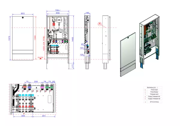 Trinkwassererwärmung max. 22 l/min, Festwertregelung 20-50 Grad Celsius, Verteiler Durchflussanzeiger min/max im Vorlaufbalken und Thermostatventileinsatz für EGO-Regelantrieb im Rücklaufbalken, kupfergelötet Plattenwärmetauscher, Aufputz-Schrank in RAL 9016