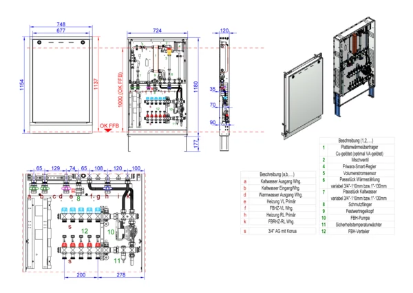 Trinkwassererwärmung max. 17 l/min, Festwertregelung 20-50 Grad Celsius, Verteiler Durchflussanzeiger 0-3 l/min und Thermostatventileinsatz für EGO-Verschluss, kupfergelötet Plattenwärmetauscher, Unterputz-Schrank mit Frontblende RAL 9016