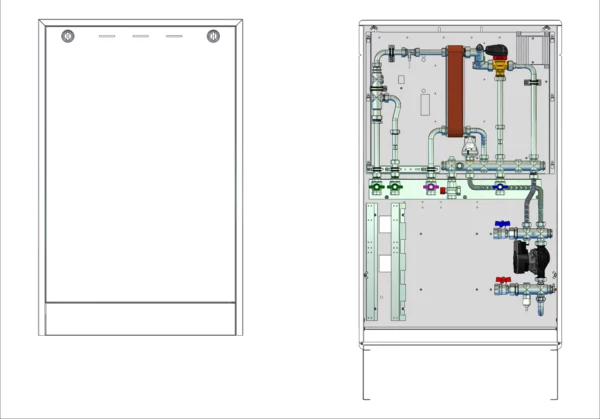 Trinkwassererwärmung max. 17 l/min und Festwertregelung 20-50 Grad Celsius für Flächenheizung, kupfergelöteter Plattenwärmetauscher, im Aufputz-Schrank in RAL 9016
