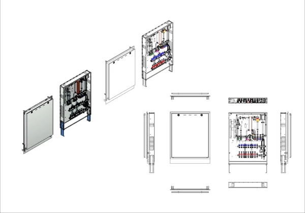 Trinkwassererwärmung max. 17 l/min, Festwertregelung 20-50 Grad Celsius und Hochtemperaturabgang, Verteiler mit Durchflussanzeiger 0-3 l/min im Vorlaufbalken und Thermostatventileinsatz M30x1,5 im Rücklaufbalken, kupfergelötet Plattenwärmetauscher, Unterputz-Schrank mit Frontblende RAL 9016
