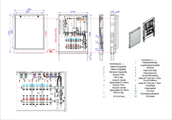 Trinkwassererwärmung max. 17 l/min, Festwertregelung 20-50 Grad Celsius und Hochtemperaturabgang, Verteiler Durchflussanzeiger 0-3 l/min und Thermostatventileinsatz für EGO-Verschluss, kupfergelötet Plattenwärmetauscher, Unterputz-Schrank mit Frontblende RAL 9016