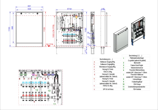 Trinkwassererwärmung max. 17 l/min, Festwertregelung 20-50 Grad Celsius und Hochtemperaturabgang, Verteiler Durchflussanzeiger 0-3 l/min und Thermostatventileinsatz für EGO-Verschluss, kupfergelötet Plattenwärmetauscher, Aufputz-Schrank in RAL 9016