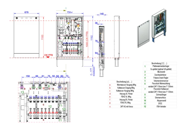 Trinkwassererwärmung mit zusätzlichem elektr. Durchlauferhitzer 13,5 kW, Verteiler mit Durchflussanzeiger 0-3 l/min im Vorlaufbalken und Thermostatventileinsatz M30x1,5 im Rücklaufbalken, kupfergelötet Plattenwärmetauscher, Aufputz-Schrank mit Frontblende RAL 9016
