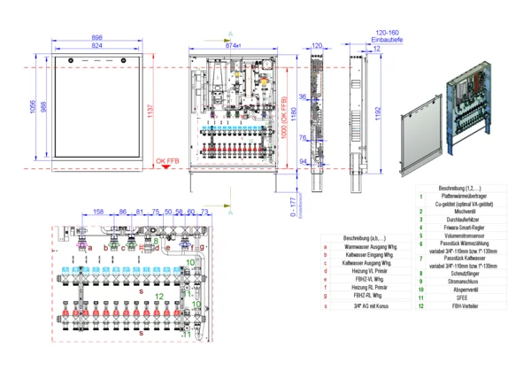 Trinkwassererwärmung mit zusätzlichem elektr. Durchlauferhitzer 13,5 kW, Verteiler mit Durchflussanzeiger min. / max. im Vorlaufbalken und Thermostatventileinsatz für EGO-Verschluss im Rücklaufbalken, kupfergelötet Plattenwärmetauscher, Unterputz-Schrank mit Frontblende RAL 9016