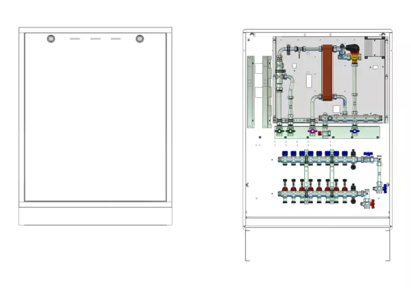 1. eitersystem mit Trinkwassererwärmung max. 17 l/min, vertikale Anschlussgarnitur mit Wärmezählerverrohrung, Verteiler mit Durchflussanzeiger 0-3 l/min im Vorlaufbalken und Thermostatventileinsatz M30x1,5 im Rücklaufbalken, kupfergelötet Plattenwärmetauscher, Unterputz-Schrank mit Frontblende RAL 9016
