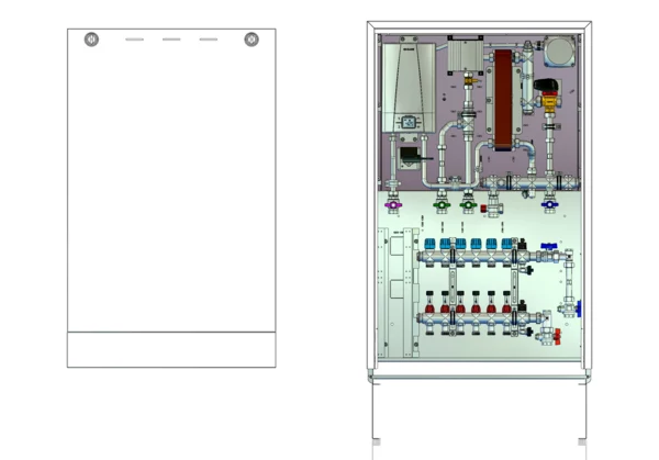 1. eitersystem mit Trinkwassererwärmung mit zusätzlichem elektr. Durchlauferhitze 21 kW, Anschlussgarnitur mit Wärmezählerverrohrung, Verteiler Durchflussanzeiger min/max + Thermostatventileinsatz für EGO, kupfergelötet Plattenwärmetauscher, Aufputz-Schrank in RAL 9016