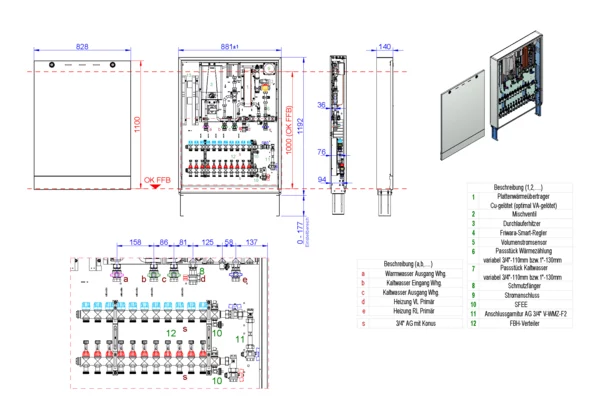 strawa Frischwasser-Wohnungsstation Friwara Hybrid WSHY1-4L18-Cu-AP-13,5 7H,BxHxT: 881 x 1182 x 140 mm, Hybrid-TW-Erwärmung mit zus. Durchlauferhitzer 11-13,5 kW, Verteiler DFA min/max + THV für EGO-Verschluss, kupfergel. PWT, AP-Schrank in RAL 9016