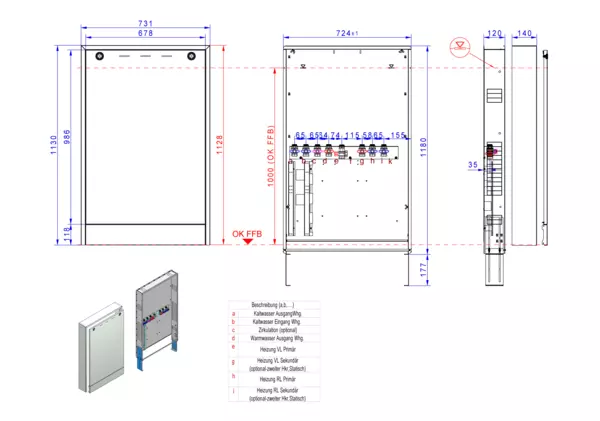 • Maße: AP-Schrank 0-6 Heizkreise: B x H x T: 731 x 1180 x 140 mm
