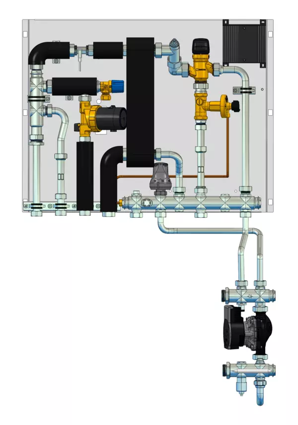 Das Frischwassermodul Friwara smart M3-WS-FBR dient der Warmwasserversorgung und zusätzlich der Versorgung und Regelung von Flächenheizungen mit Festwertregler 20-50 °C mit integrierter Pumpe.