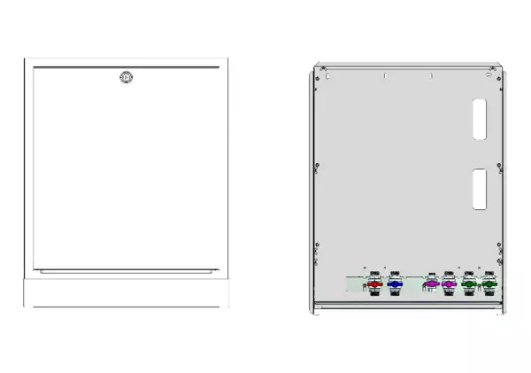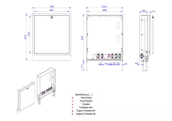 Modul 1, bestehend aus Schrank mit Anschlussleise für modulare Bauweise der Frischwasser-Wohnungsstation Friwara-W22-UP mit Zirkulation