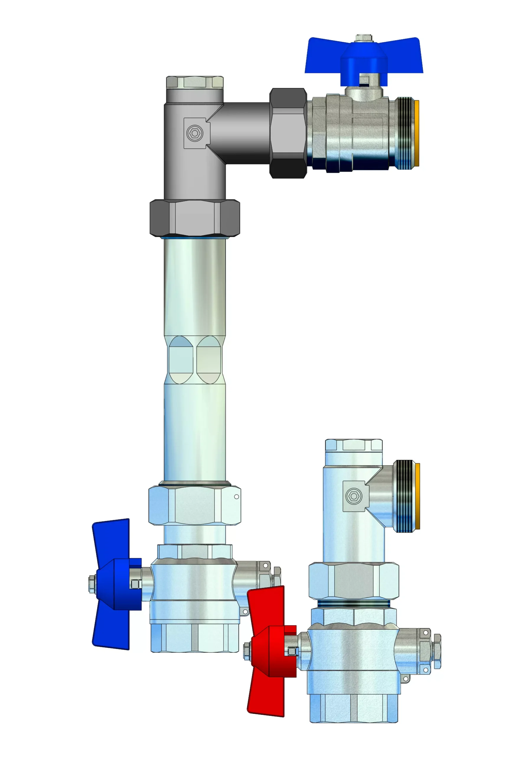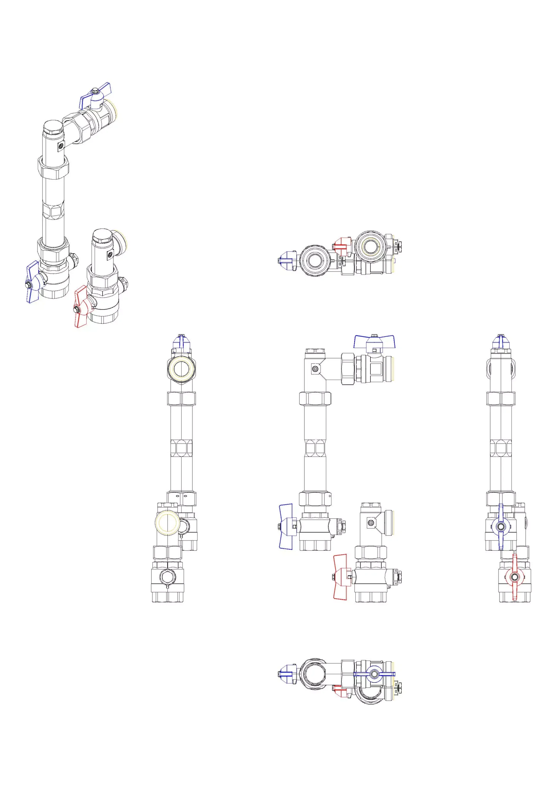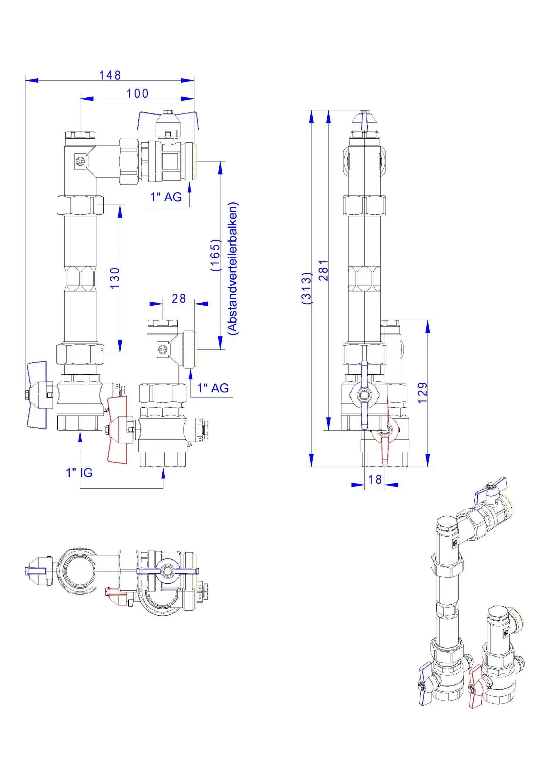 • zwei 1" Kugelhähne (Flügelgriff rot für Vorlauf bzw. blau für Rücklauf) mit Fühleranschluss für direkteintauchende Fühler (D= 5-5,2 mm, M10x1-IG IG) im Vor- und Rücklauf, Material: Press-Messing CW617N