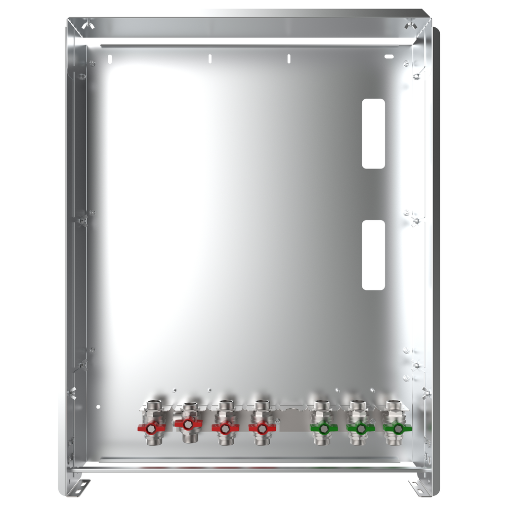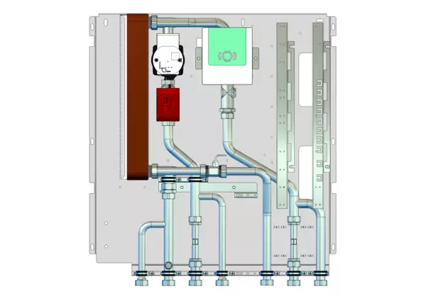 Frischwassermodul auf Montageplattefür modulare Bauweise der Frischwasser-Wohnungsstation Friwara-W22-HT. Das Frischwasser-Modul dient der Warmwasserversorgung und der Wärmeversorgung statischer Heizflächen (z-B. Heizkörper).