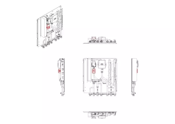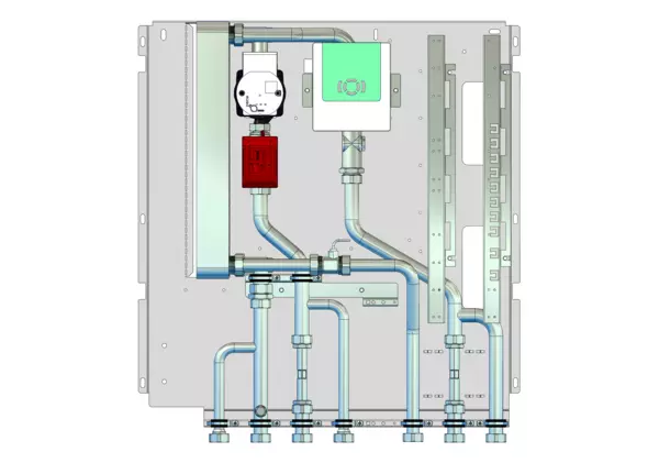 Frischwassermodul auf Montageplatte für modulare Bauweise der Frischwasser-Wohnungsstation Friwara-W22-HT. Das Frischwasser-Modul dient der Warmwasserversorgung und der Wärmeversorgung statischer Heizflächen (z-B. Heizkörper).