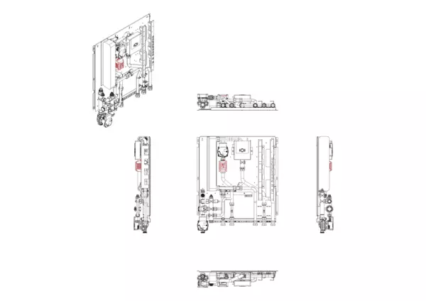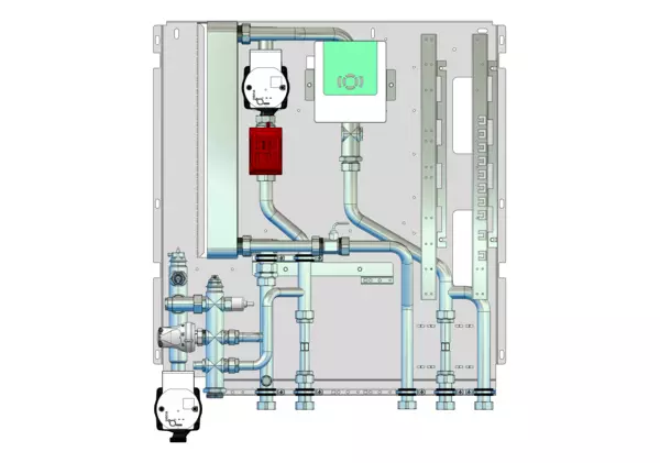 Frischwassermodul auf Montageplatte für modulare Bauweise der Frischwasser-Wohnungsstation Friwara-W22-FBR. Das Frischwassermodul dient der Warmwasserversorgung und zusätzlich der Versorgung und Regelung von Flächenheizungen mit Festwertregler 20-50 °C mit integrierter Pumpe.