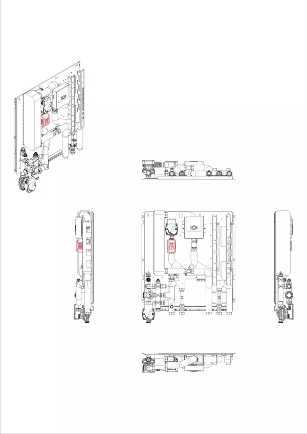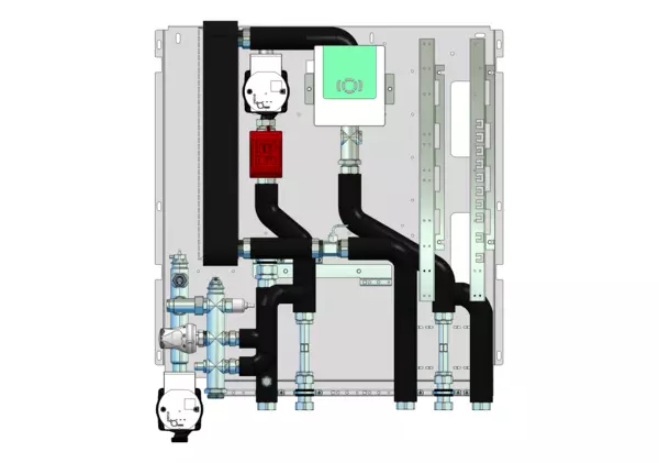 Frischwassermodul auf Montageplatte für modulare Bauweise der Frischwasser-Wohnungsstation Friwara-W22-FBR. Das Frischwassermodul dient der Warmwasserversorgung und zusätzlich der Versorgung und Regelung von Flächenheizungen mit Festwertregler 20-50 °C mit integrierter Pumpe.
