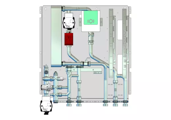 Frischwassermodul auf Montageplatte für modulare Bauweise der Frischwasser-Wohnungsstation Friwara-W32-FBR. Das Frischwassermodul dient der Warmwasserversorgung und zusätzlich der Versorgung und Regelung von Flächenheizungen mit Festwertregler 20-50 °C mit integrierter Pumpe.