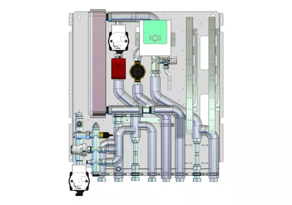 Frischwassermodul auf Montageplatte für modulare Bauweise der Frischwasser-Wohnungsstation Friwara-W22-FBR-HT. Das Frischwassermodul dient der Warmwasserversorgung und der Versorgung und Regelung von Flächenheizungen mit Festwertregler 20-50 °C mit integrierter Pumpe.
